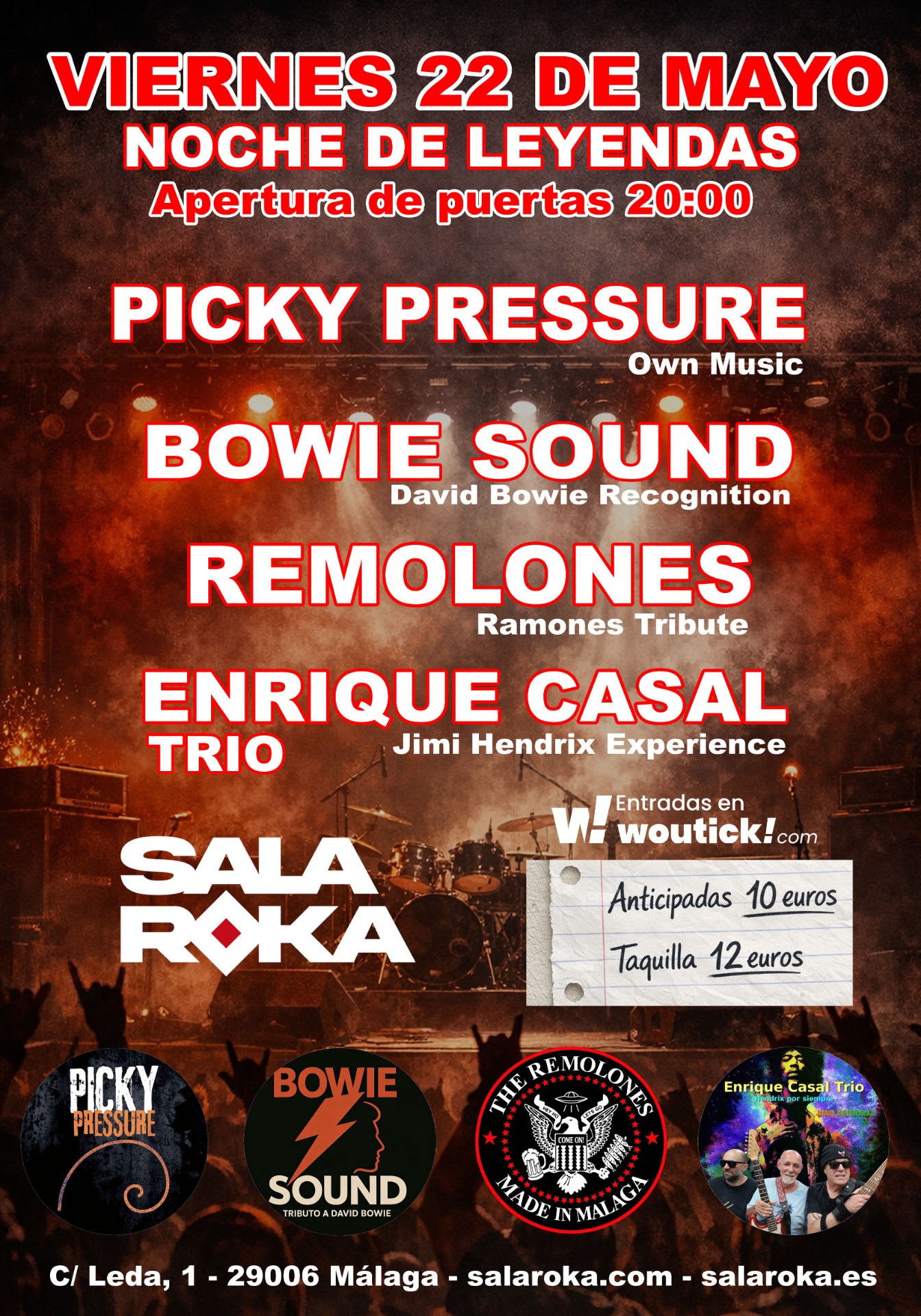 SALA ROKA ES UN ESPACIO DEDICADO A LA MÚSICA EN TODAS SUS FORMAS, UBICADO EN EL POLÍGONO INDUSTRIAL PÉREZ TEXEIRA DE MÁLAGA, JUNTO AL RECINTO FERIAL DE LA CIUDAD. AUNQUE ESTAMOS ALEJADOS DEL BULLICIOSO CENTRO, ESTA UBICACIÓN OFRECE IMPORTANTES VENTAJAS. AQUÍ, EL PÚBLICO DISFRUTA DE LA FACILIDAD DE APARCAMIENTO Y DE UN ACCESO SENCILLO, SIN TENER QUE ENFRENTARSE AL TRÁFICO DENSO DE UNA DE LAS CIUDADES MÁS TURÍSTICAS Y DE MODA DEL MOMENTO. CON UNA CAPACIDAD PARA 600 PERSONAS, SALA ROKA NACE CON LA FIRME CONVICCIÓN DE CONVERTIRSE EN UN REFERENTE PARA CONCIERTOS, EVENTOS Y ENCUENTROS MUSICALES EN LA COSTA DEL SOL, PROPORCIONANDO UN ENTORNO DONDE LA CULTURA MUSICAL PUEDE EXPANDIRSE SIN LÍMITES.
